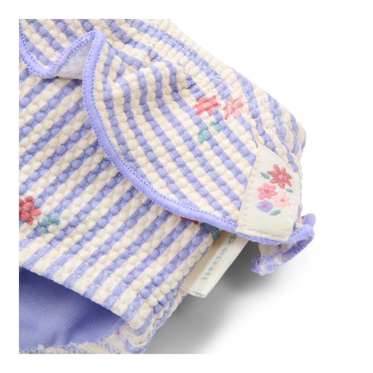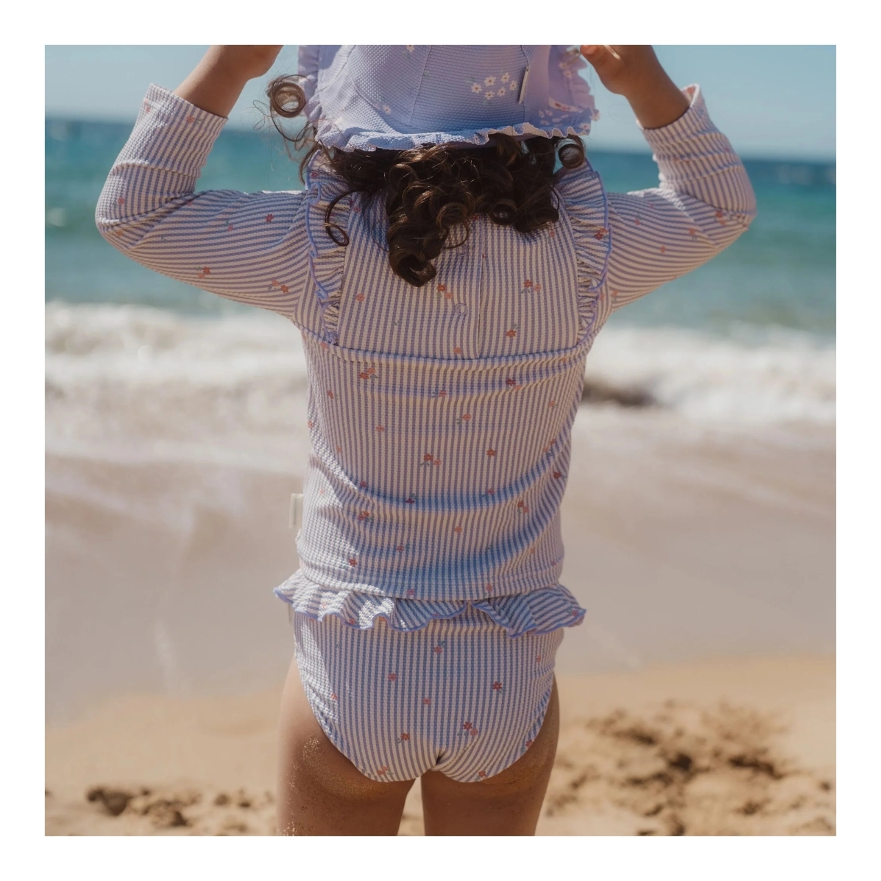 Die dünnen Streifen und sanften Töne sorgen für einen frischen und eleganten Look, während die Rüschenbordüre entlang des Kostüms für eine lebendige und verspielte Note sorgt, ideal für Mädchen, die es lieben, sich besonders zu fühlen.