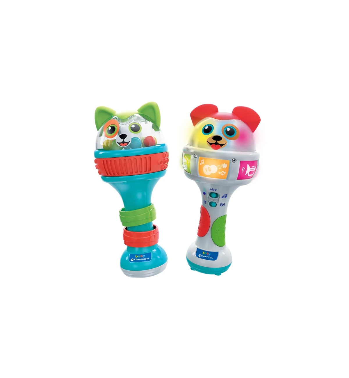 A pair of interactive maracas with two cute characters that will help you discover the name of the instruments, the colors and the first English to the rhythm of music, sounds and colored lights. By shaking the doggie maraca and pressing its keys, the child can have fun listening to and accompanying the melodies with the sound of the various instruments.