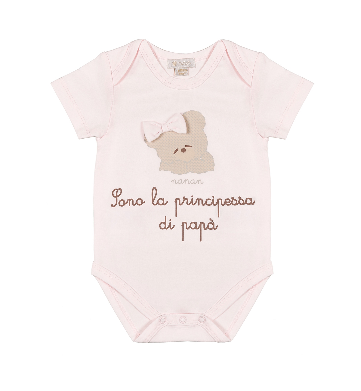 Adorable body embellished with a tender writing. Bottom placket.