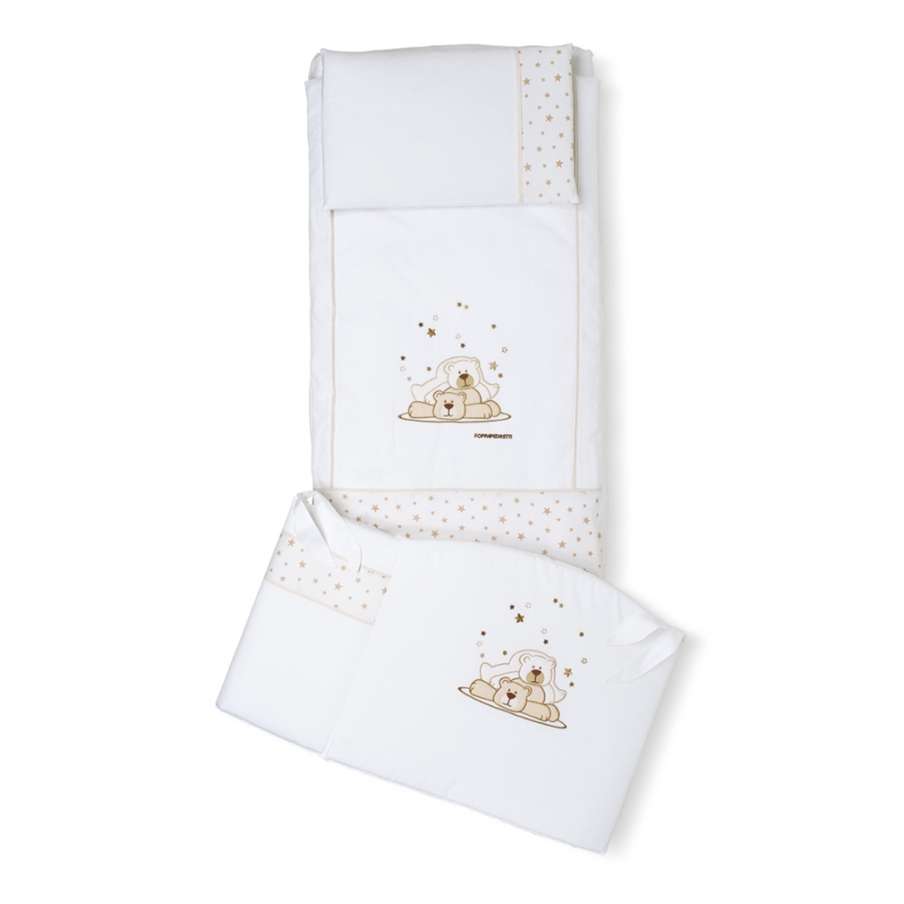 The Dolcestella duvet set by Foppapedretti is characterized by embroideries with the fun playful bears and the little stars that distinguish the collection. The textile set consists of bumpers, removable bag, padding and pillow case.
