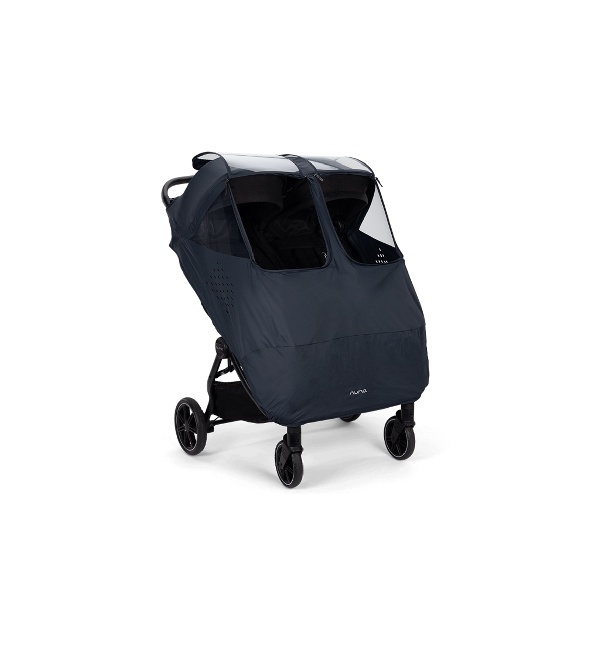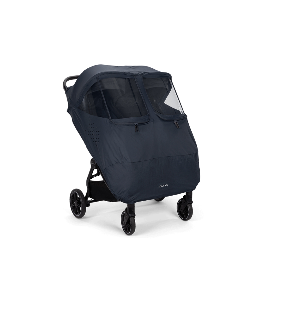 La protección contra el viento para TRVL dubl protege contra los elementos por todos lados, de la cabeza a los pies. Los protectores transparentes se abren con una cremallera por separado para facilitar el acceso de cada niño y ofrecen dos acogedoras ventanas al mundo, independientemente del clima.
