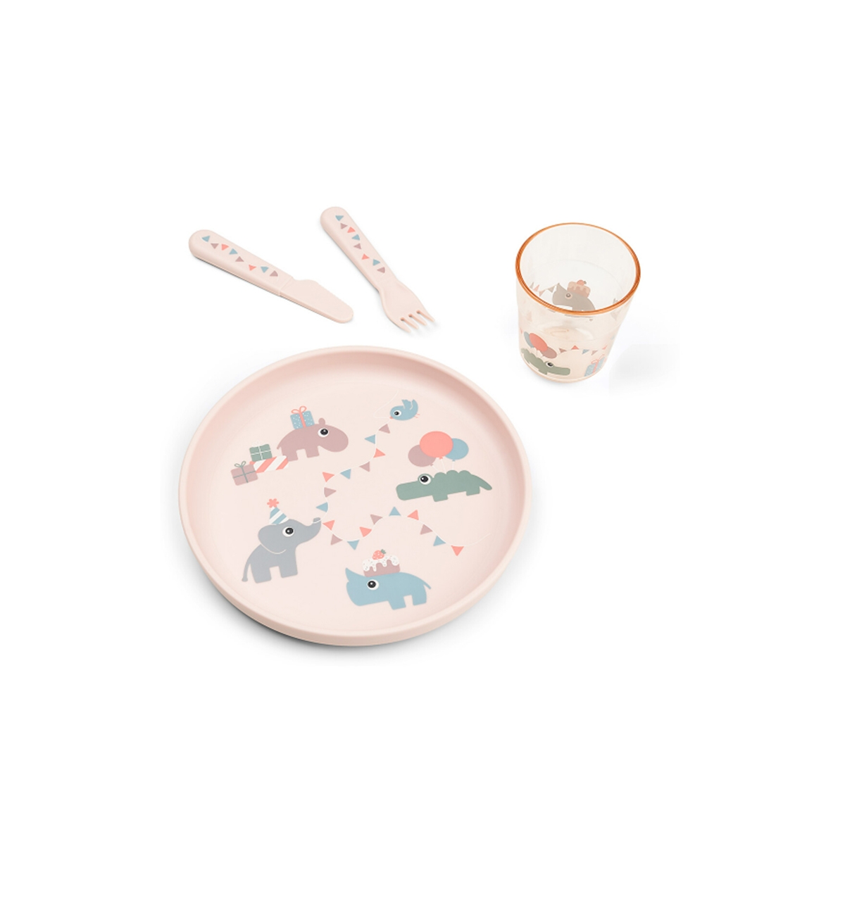 Il set pappa Foodie "Celebration" è composto da un piatto, bicchiere, forchetta e coltello, progettati per rendere più semplici e sicuri i primi pasti dei bambini.