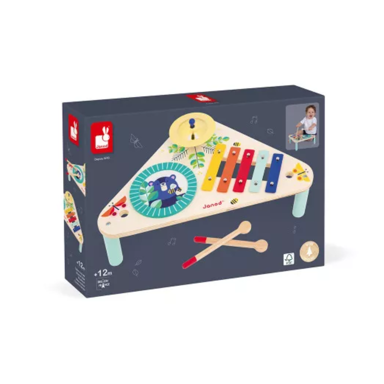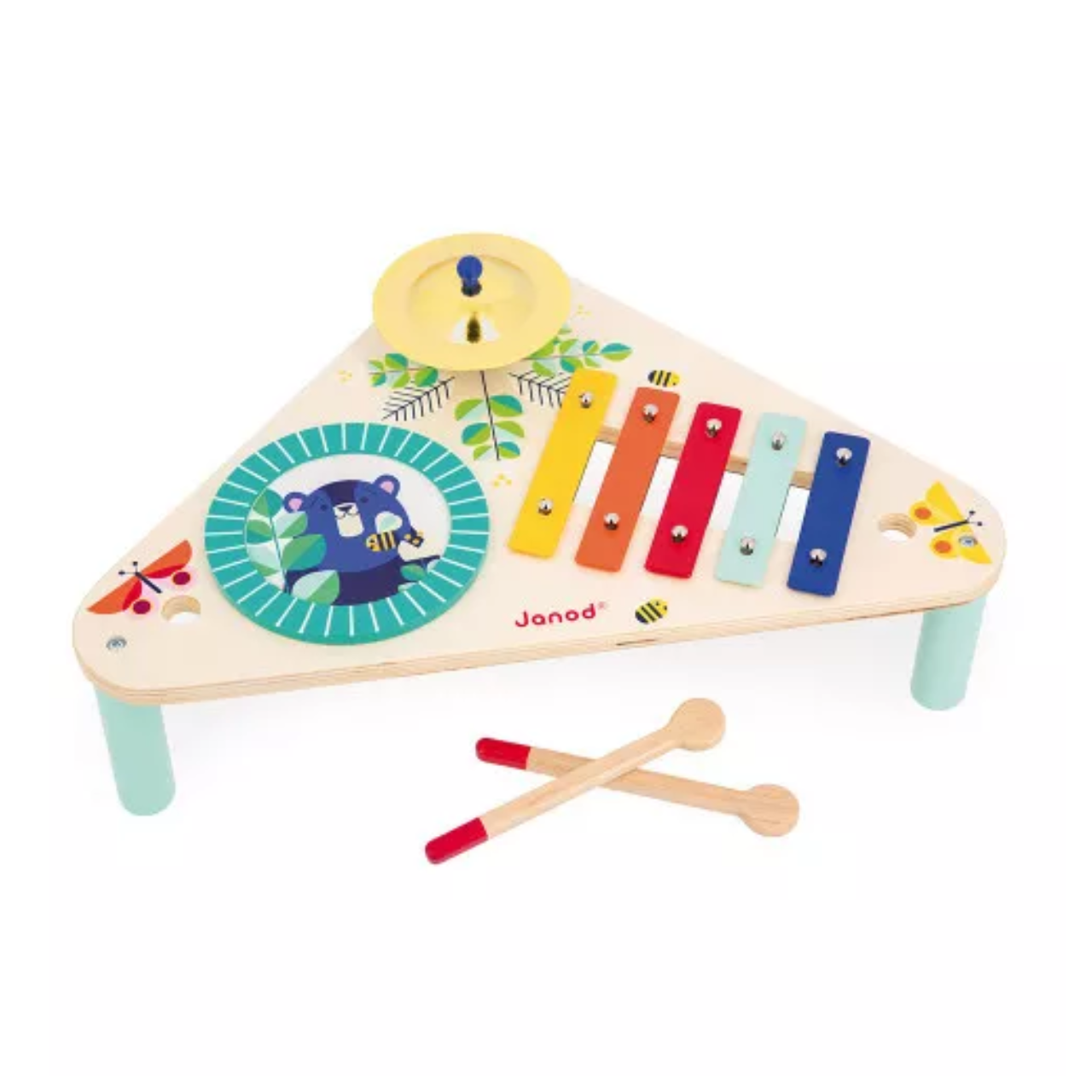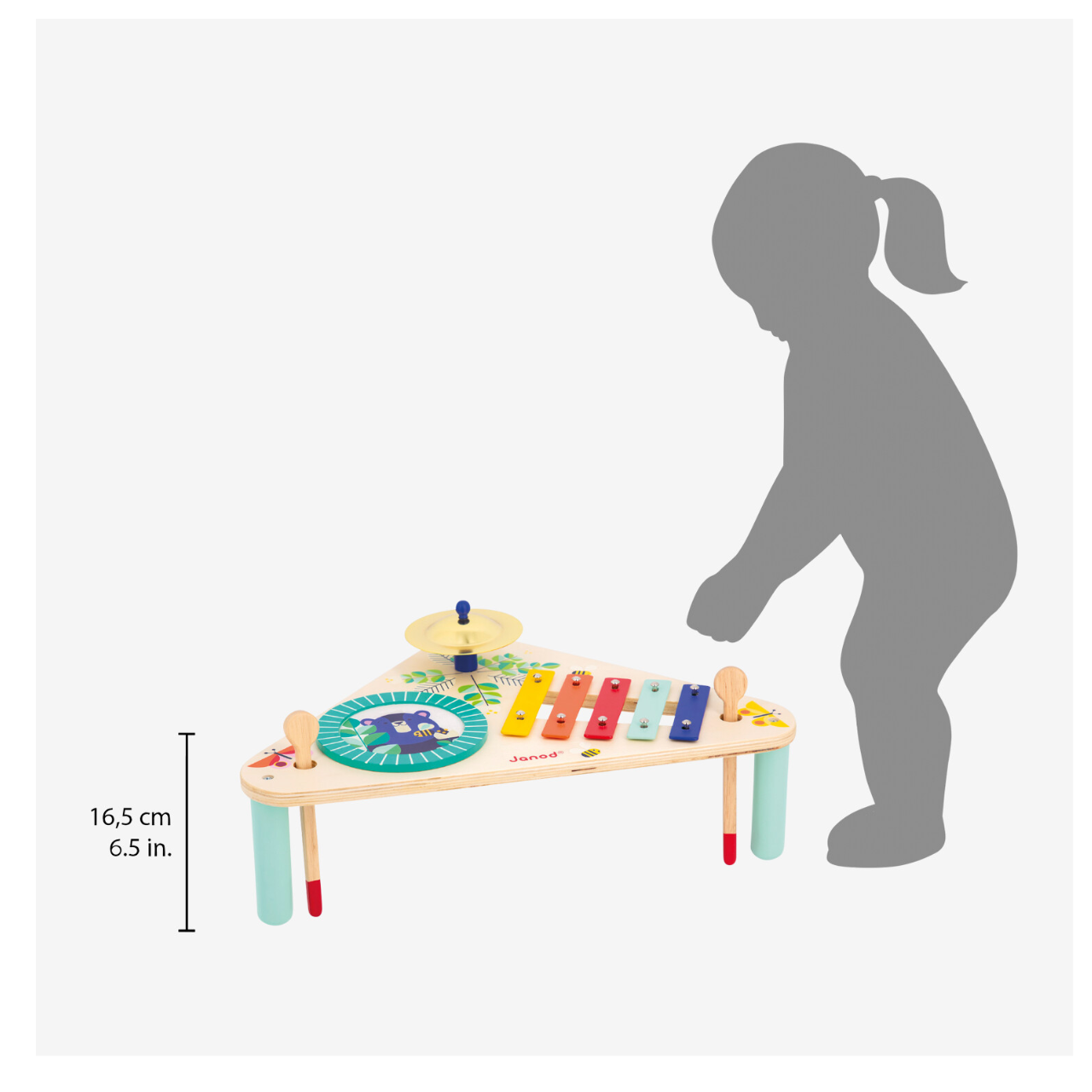 Un tavolo musicale in legno della collezione Gioia, adatto a bambini dai 12 mesi in su, per esplorare suoni e ritmi. Include tamburo, piatto e xilofono a cinque note, con spazio integrato per le due bacchette in dotazione. Il giocattolo, decorato con illustrazioni di api, farfalle e un orsetto, è in legno certificato FSC™ e favorisce l'esplorazione multisensoriale e lo sviluppo musicale del bambino.