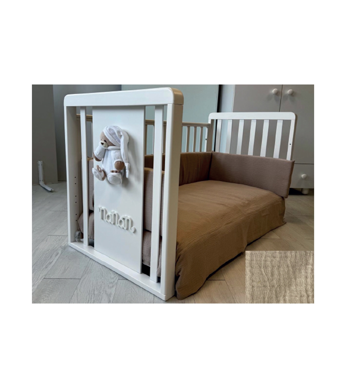 Incluso: cinghie di fissaggio al letto dei genitori per il co-sleeping incluse, kit 4 ruote di cui 2 con freno, spondine con guaina antimorso nella parte superiore.