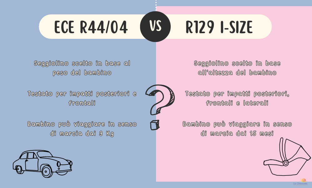 Prima di acquistare il seggiolino scoprirai che ci sono 2 normative di legge attualmente disponibili in Europa, quindi potrai trovare dei seggiolini omologati secondo la normativa ECE R44/04 o R129 i-Size, ma quali sono le differenze?