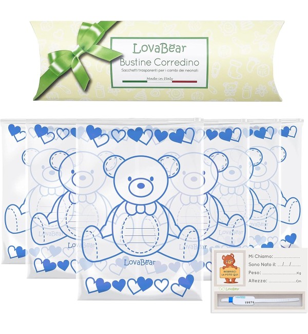 Riponi gli indumenti del tuo bebè al sicuro da polvere e batteri, suddividendoli giorno per giorno nelle Bustine Lovabear. Le uniche Made in Italy, inodori e sicure. Contiene 6 bustine.
