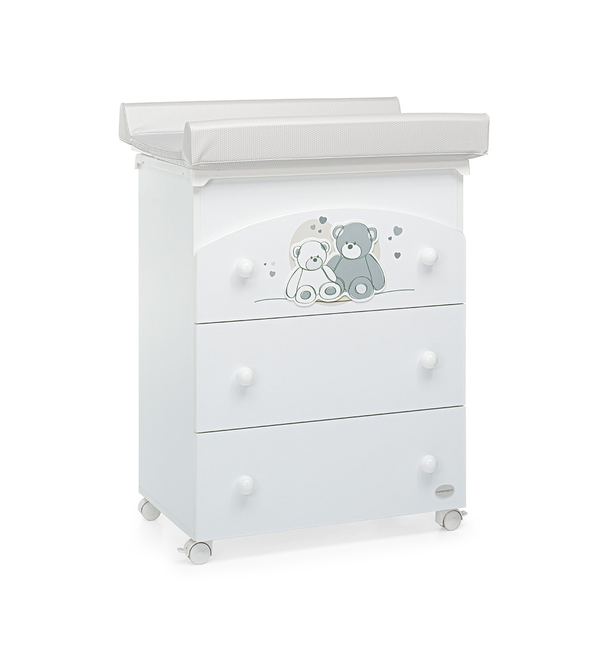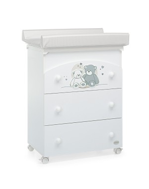 Il bagnetto fasciatoio della collezione Mascotte di Foppapedretti è dotato di piano ribaltabile con sistema di sicurezza ammortizzato e vaschetta anatomica estraibile. È dotata di tre ampi cassetti ed un pratico materassino fasciatoio. Il cassetto superiore è caratterizzato da un decoro che raffigura due graziosi orsetti. Ha 4 ruote piroettanti, di cui 2 con freno. Dimensioni: 131 x 50 x 69 cm.