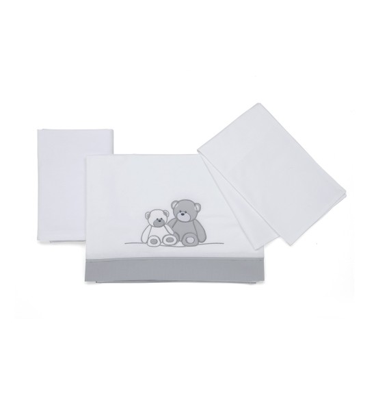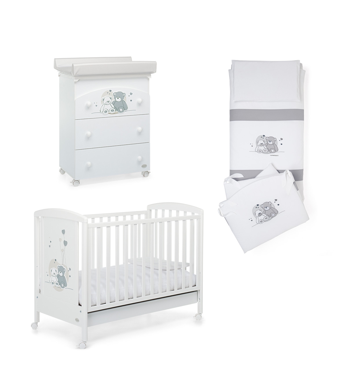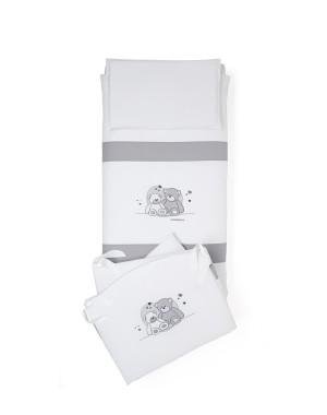 Il completo piumone della collezione Mascotte di Foppapedretti è composto da: paracolpi, sacco sfoderabile, imbottitura e federa per cuscino. Caratterizzato da ricami con due teneri orsetti e cuoricini, nelle tonalità del grigio.