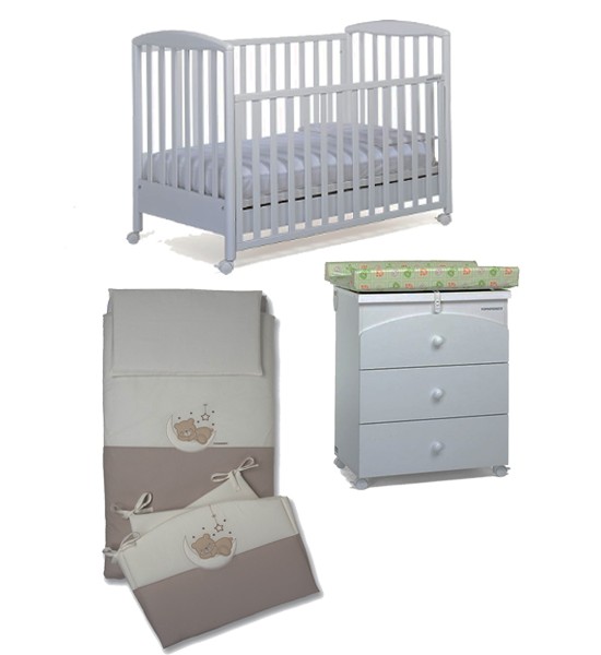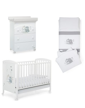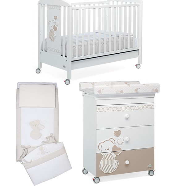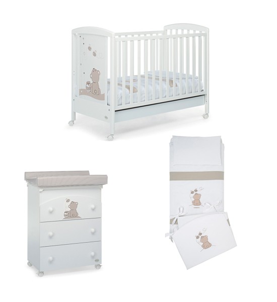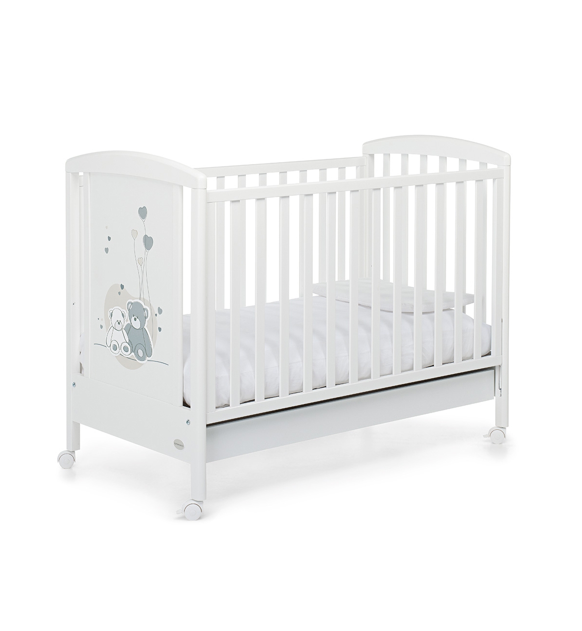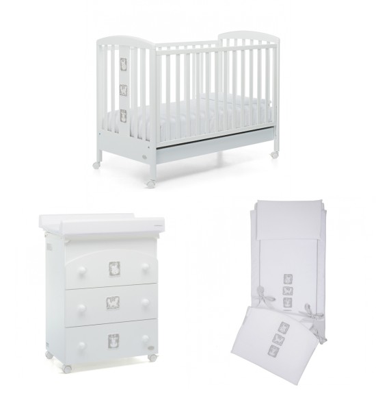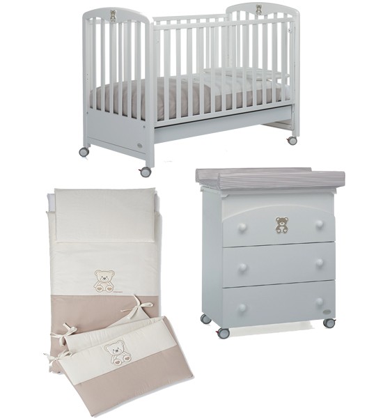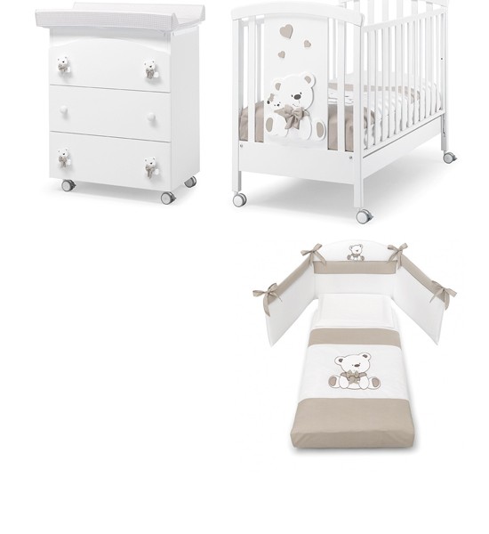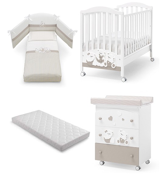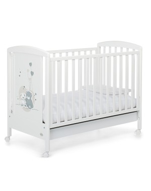 Il lettino della collezione Mascotte di Foppapedretti presenta una testata con pannello decorato che raffigura due dolcissimi orsetti. Ha sponda regolabile a due posizioni, struttura in legno di faggio e verniciato oon vernici atossiche, e rete regolabile su due altezze. Per facilitarne gli spostamenti, ha quattro ruote di cui due con freno. Dimensioni: 103 x 71 x 131 cm.