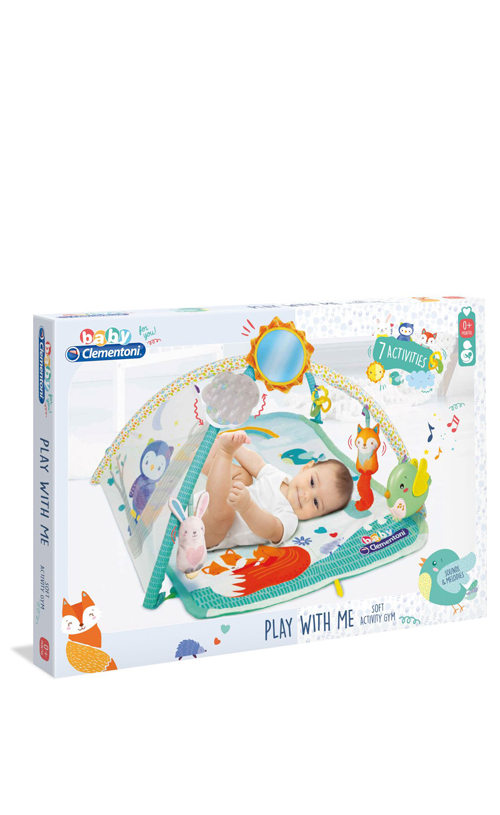 Una colorata Palestrina con tante attività che il bambino può svolgere con i genitori o in autonomia, con morbidi pendenti in plastica e stoffa supporta lo sviluppo delle capacità manuali, visive ed uditive del bambino. I soffici personaggi gatto ed uccellino stimolano la manualità del bambino. La nuvola è un sonaglino che simula il rumore della pioggia, mentre i pendenti morbidi sono perfetti per la fase della dentizione. I personaggi illustrati nel tappeto richiamano gli accessori e la loro funzione, guidando i genitori nel gioco con il bambino.