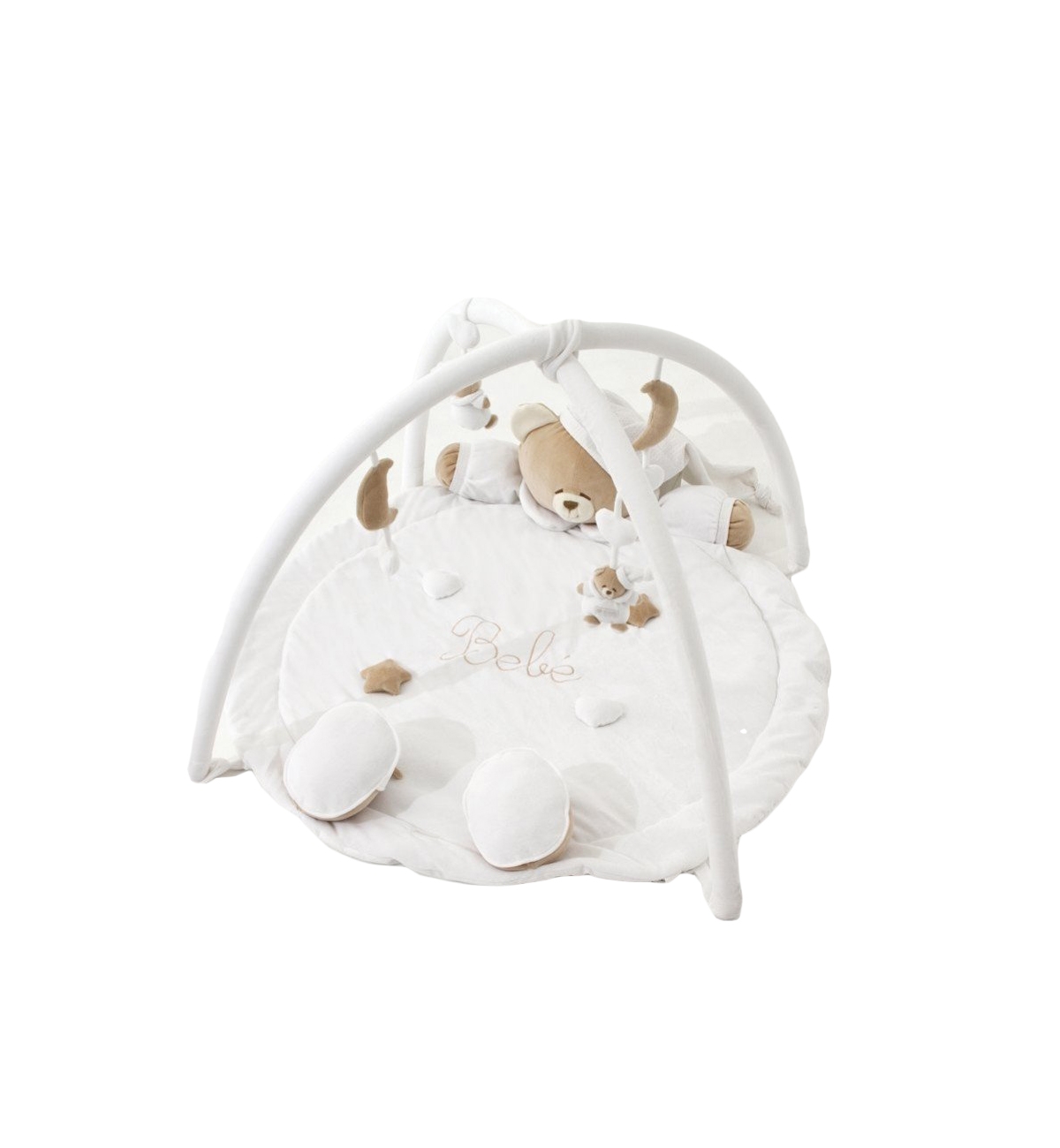 La palestrina Nanan Tato e un luogo magico, di gioco e di apprendimento. Un morbido tappeto di ciniglia, leggermente imbottito con fibra di ovatta, da cui spuntano la testa ed i piedi del tenero orso. Stelline sonore, cuoricini, lune e orsetti appesi stimolano le prime percezioni e la fantasia del bebe.