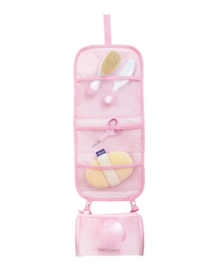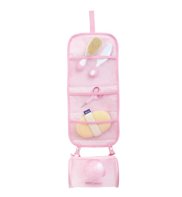 Si compone di una borsa multi-tasca è dotata di gancio per essere comodamente appesa che contine i prodotti necessari all’igiene quotidiana del bambino tra cui:
