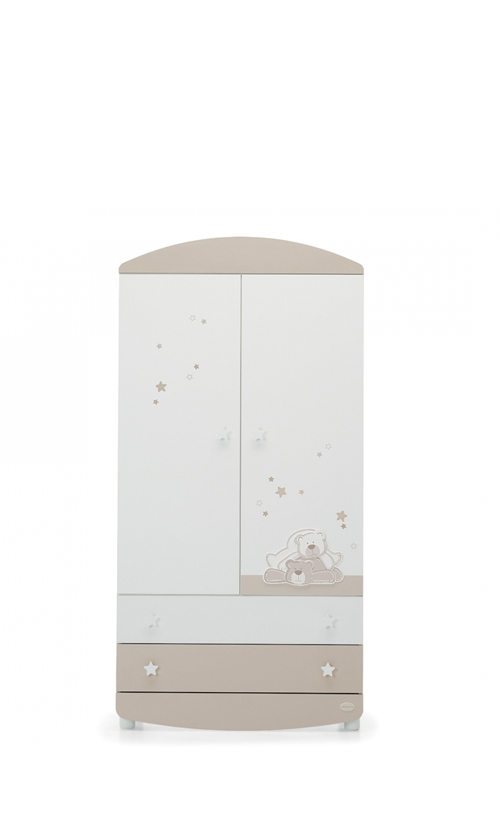 Il capiente armadio in legno a due ante Dolcestella di Foppapedretti ha due spaziosi cassetti, ampi vani con piani regolabili e due barre appendiabiti. Le maniglie sono a forma di stella e le due ante hanno applicazioni con i personaggi che caratterizzano la collezione: divertenti orsetti giocherelloni e tante stelline raffinate. La struttura e 100% made in Italy.