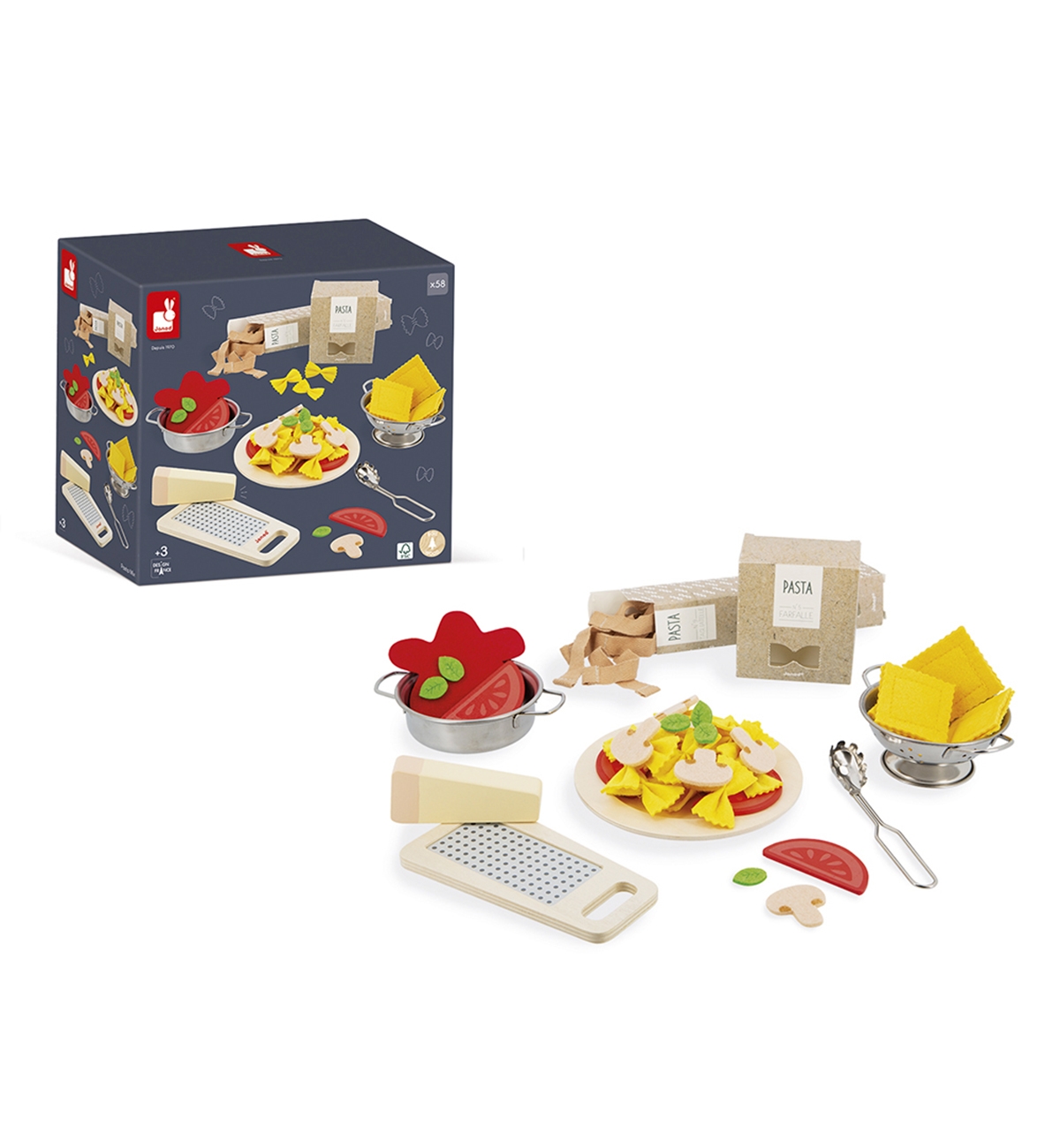 Questo set include tutto l'occorrente per immaginare prelibati piatti di pasta, all'italiana o alla francese, che saranno apprezzati da tutti. Per creare le loro specialità, i bambini dai 3 anni in su potranno utilizzare i numerosi accessori inclusi: 20 farfalle incredibilmente verosimili, 4 grandi ravioli, 6 foglie di basilico, 5 funghi e 1 salsa di pomodoro, tutti in feltro. Le 10 tagliatelle sono formate con un nastro piatto che imita perfettamente il colore di questa ottima pasta! E per guarnire i piatti dei piccoli chef, non c'è niente di meglio del parmigiano con grattugia e dei pomodori di legno. Il cucchiaio, lo scolapasta, la pentola in metallo e il piatto inclusi permettono di servire la pasta in modo realistico. I due pratici pacchetti in cartone permettono di conservare la pasta per non perderla. Questo giocattolo di imitazione è perfetto come accessorio delle cucine per bambini. Stimola l'immaginazione e i momenti di condivisione in famiglia e con gli amici. Questo prodotto è realizzato con materiali certificati FSC® e materiali controllati.
